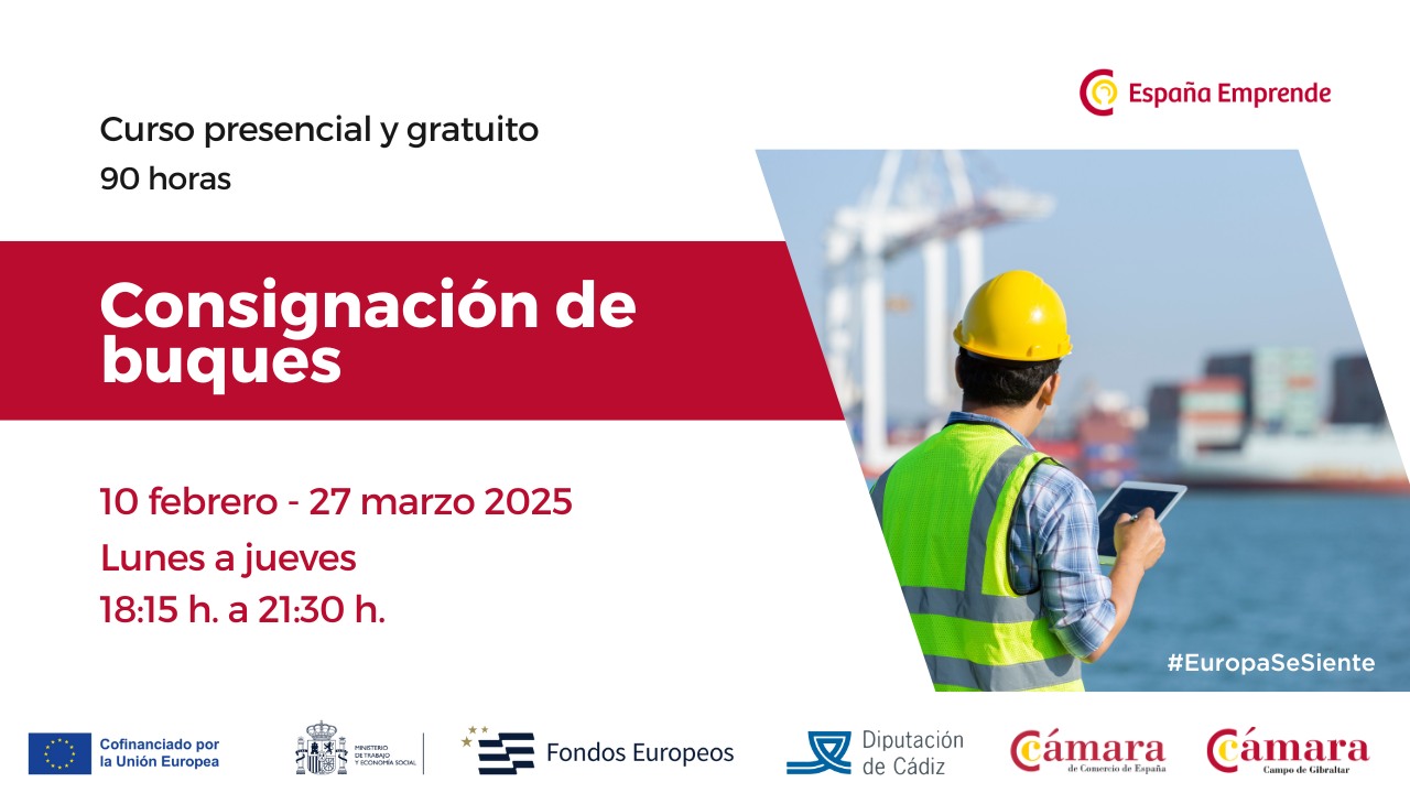 Este curso en consignación de buques gratuito se engloba dentro las actividades y servicios enmarcados dentro del Programa Plan de Emprendimiento – España Emprende impulsado por la Cámara de Comercio, a través de la Cámara de España y cofinanciado por el Fondo Social Europeo (FSE+) y la Diputación de Cádiz.