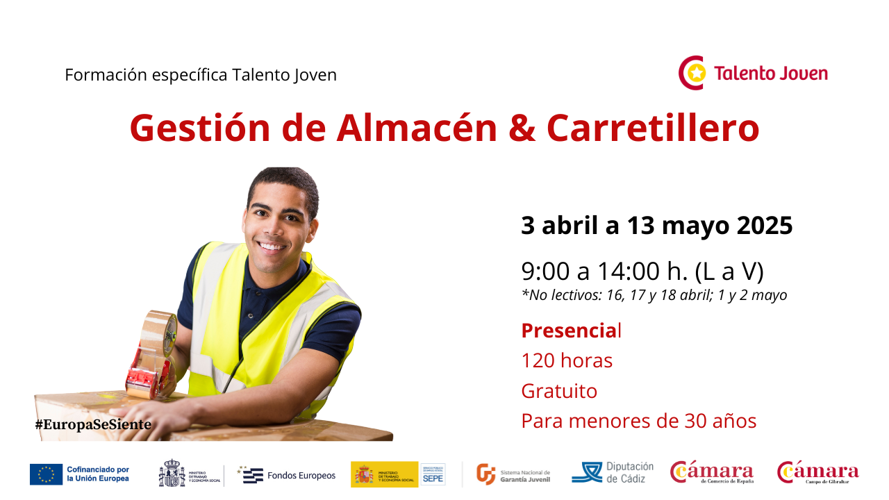 Dentro de la agenda formativa TALENTO JOVEN 2025 de la Cámara de Comercio del Campo de Gibraltar lanzamos la formación específica TALENTO JOVEN: Curso en GESTIÓN DE ALMACÉN, LOGÍSTICA Y MANEJO DE CARRETILLA ELEVADORA