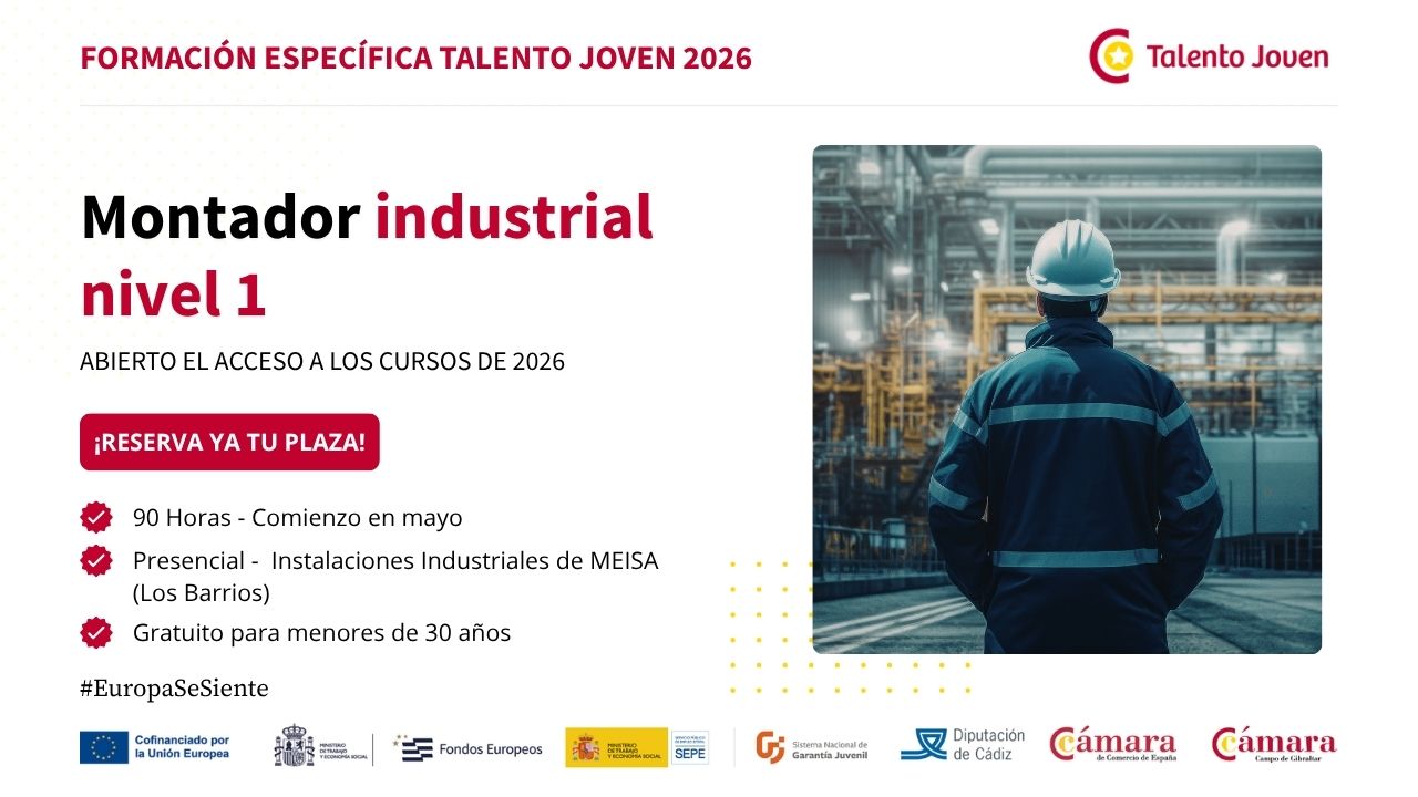 Dentro de la agenda formativa Talento Joven 2026 de la Cámara de Comercio del Campo de Gibraltar lanzamos la formación específica TALENTO JOVEN: Formación en MONTAJE DE ESTRUCTURAS INDUSTRIALES, nivel 1.