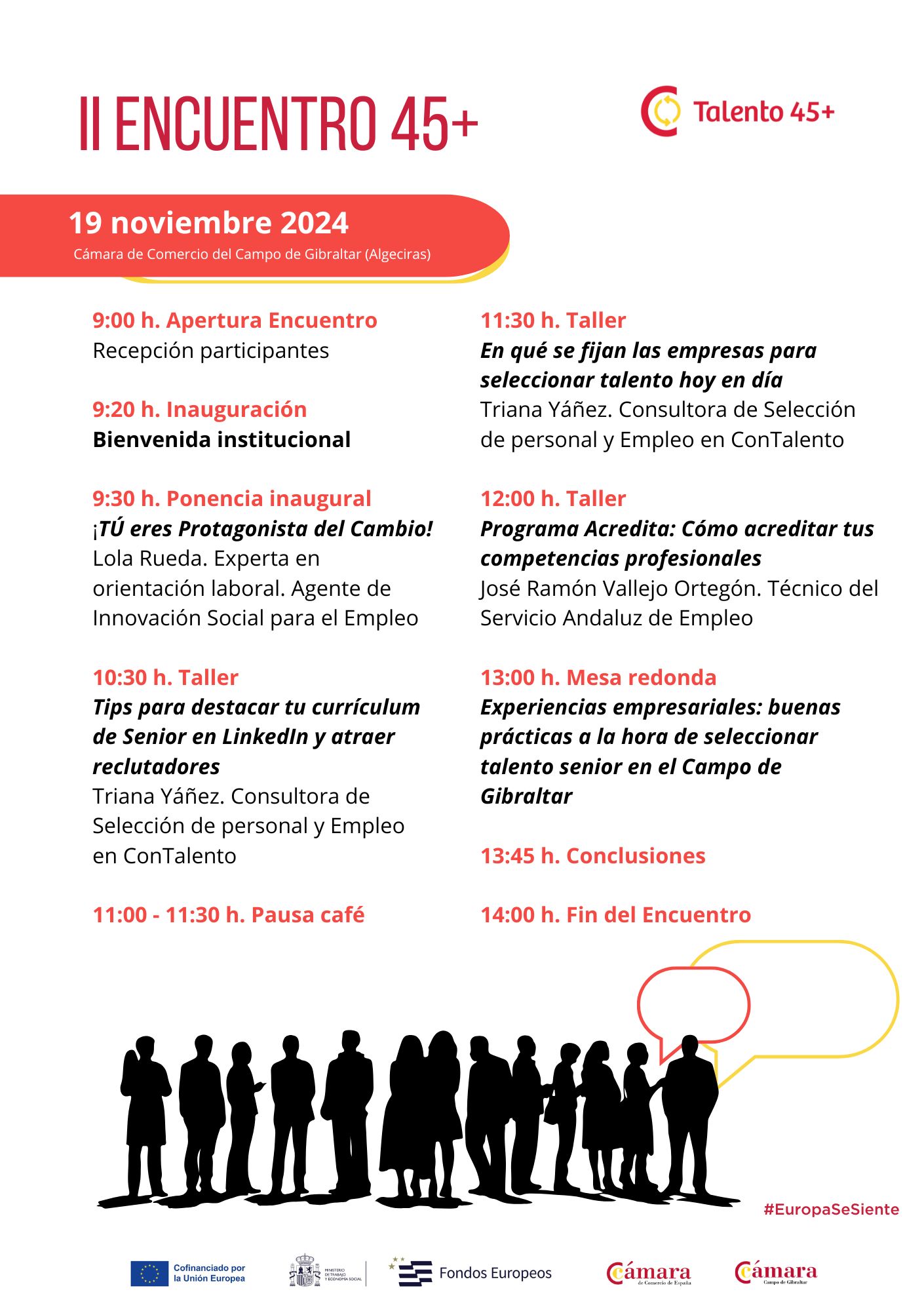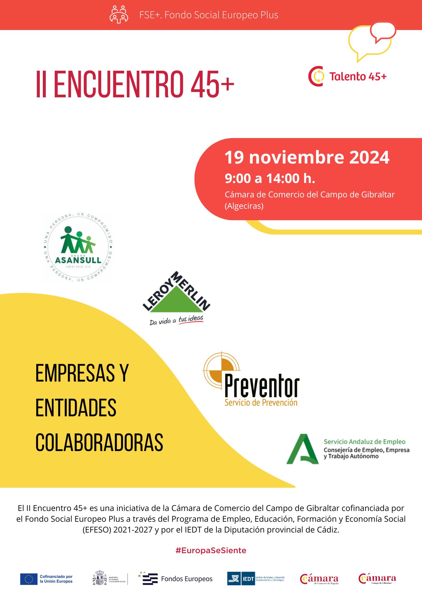 El Encuentro 45+ es una iniciativa impulsada por la Cámara de Comercio del Campo de Gibraltar dentro del programa Talento 45+, actuación cofinanciada por la Unión Europea a través del Fondo Social Europeo Plus 2021-2027 en el marco del Programa EFESO.